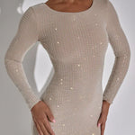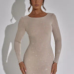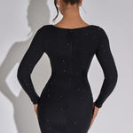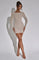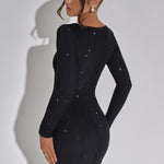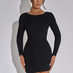 The long sleeves balance the mini length, offering a polished and elegant contrast that makes this dress perfect for evening occasions. The sculpted fit creates a smooth, streamlined appearance that elongates the body, giving you a confident and statuesque look. Whether worn to cocktail parties, formal dinners, celebrations, or glamorous nights out, this dress delivers effortless sophistication.