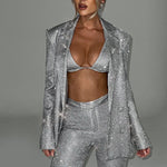 Command attention in this dazzling grey sparkle co-ord set — a bold three-piece ensemble featuring an oversized blazer, triangle bralette and tailored trousers. The shimmering fabric catches every light, while the structured tailoring adds balance to the playful glamour. Whether you're heading to a party, New Year's celebration or a red carpet event, this look was made to be seen.