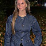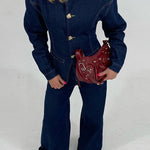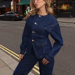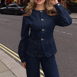 Elevate your everyday style with this tailored denim co-ord set — a refined take on casual dressing. Featuring a structured denim jacket with elegant gold clasp fastenings and matching wide-leg trousers, this two-piece set blends vintage charm with modern confidence. Designed with precision seamwork and flattering lines, it brings effortless sophistication to daytime dressing. Wear as a full set for impact, or mix and match to suit your personal style.