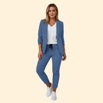 This two-piece set includes a blazer with long sleeves and a coordinated bottom featuring an adjustable drawstring. The blazer has a tailored outline, while the bottom provides a simple closed waistband. The lightweight build presents a neat appearance suitable for relaxed moments or routine outings.