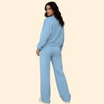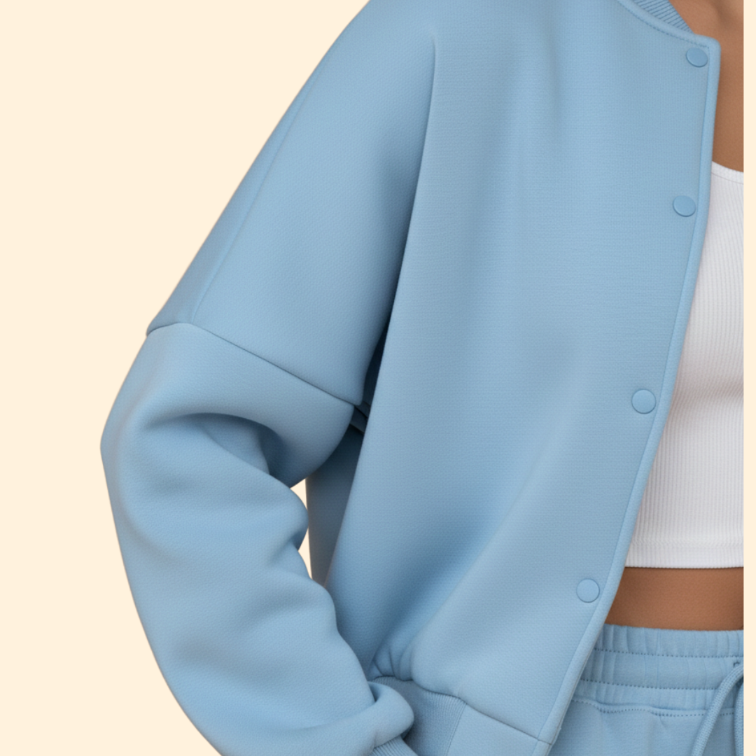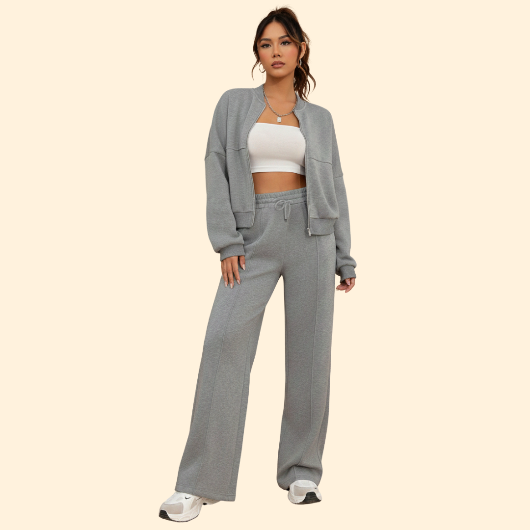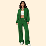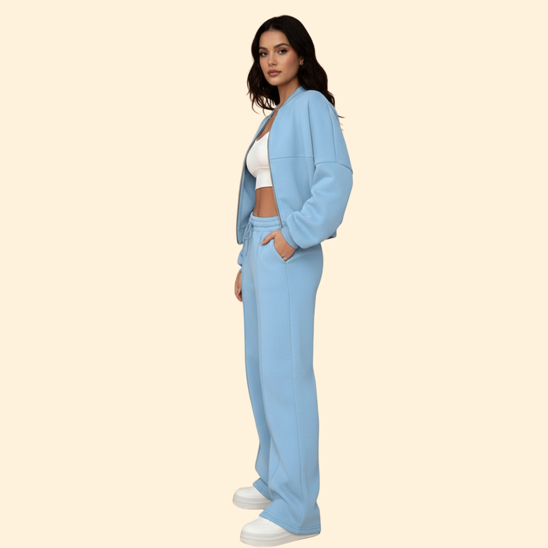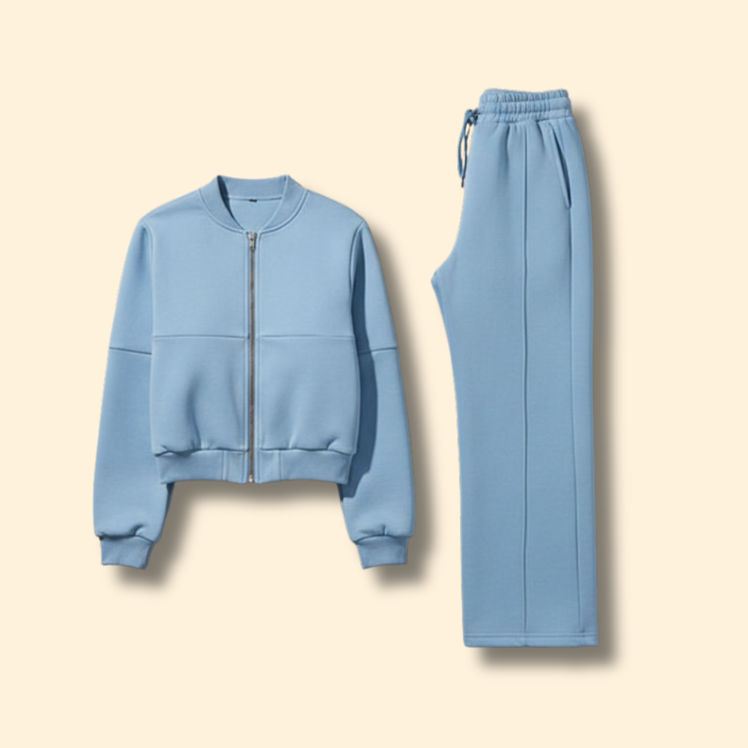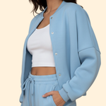 Two piece set consisting of a bomber jacket and matching trousers. The jacket features a front zip closure, ribbed cuffs, and a ribbed hem with a relaxed cut. The trousers have a straight tailored shape with an elasticated waistband. Both pieces have a plain surface suitable for coordinated wear.