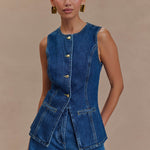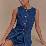 Structured Sleeveless Top: Button-up design with a clean, modern silhouette.