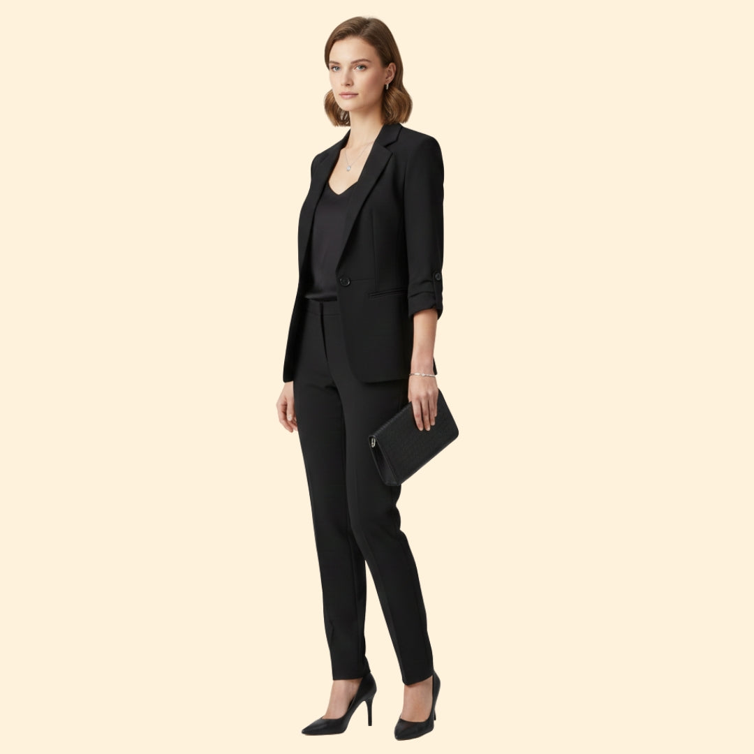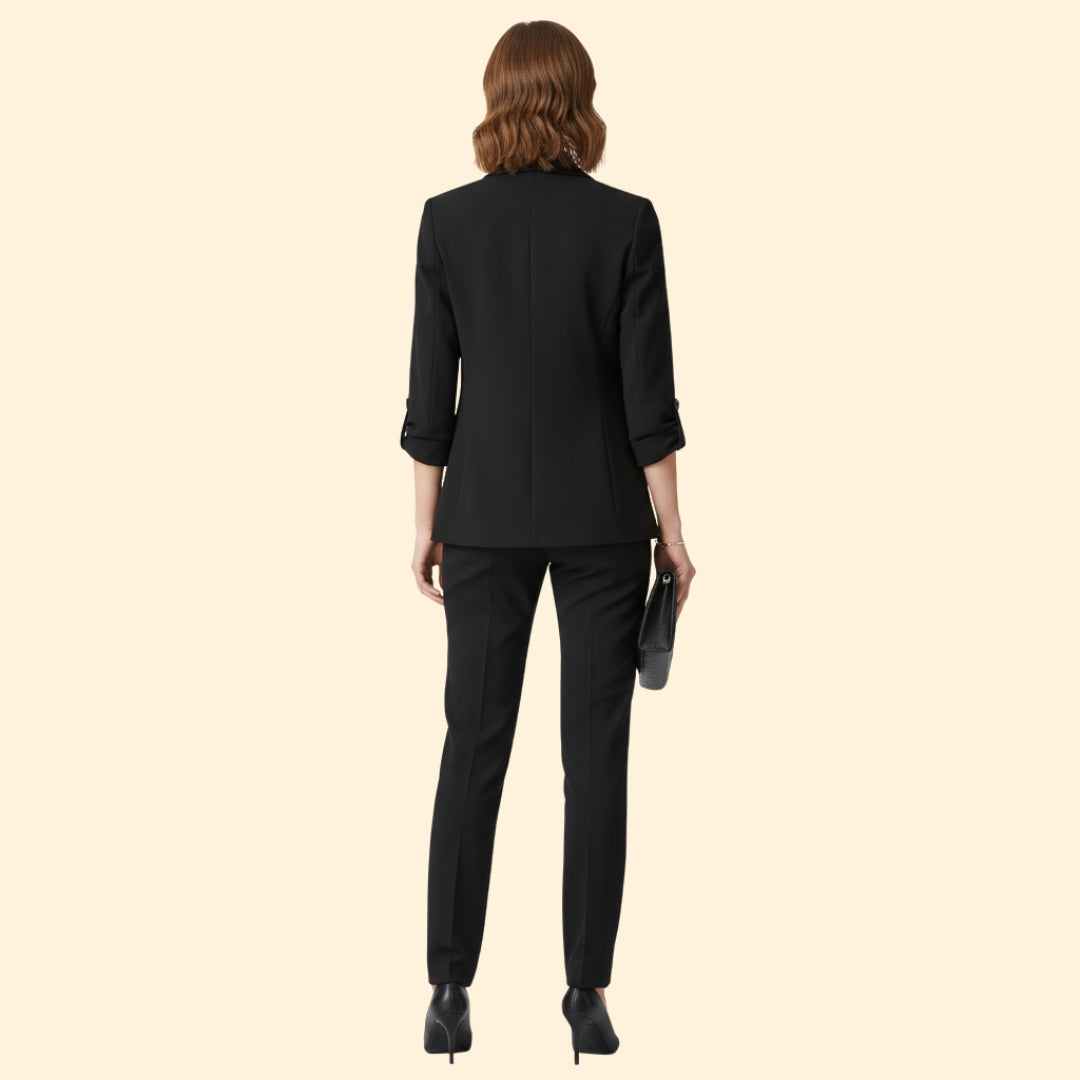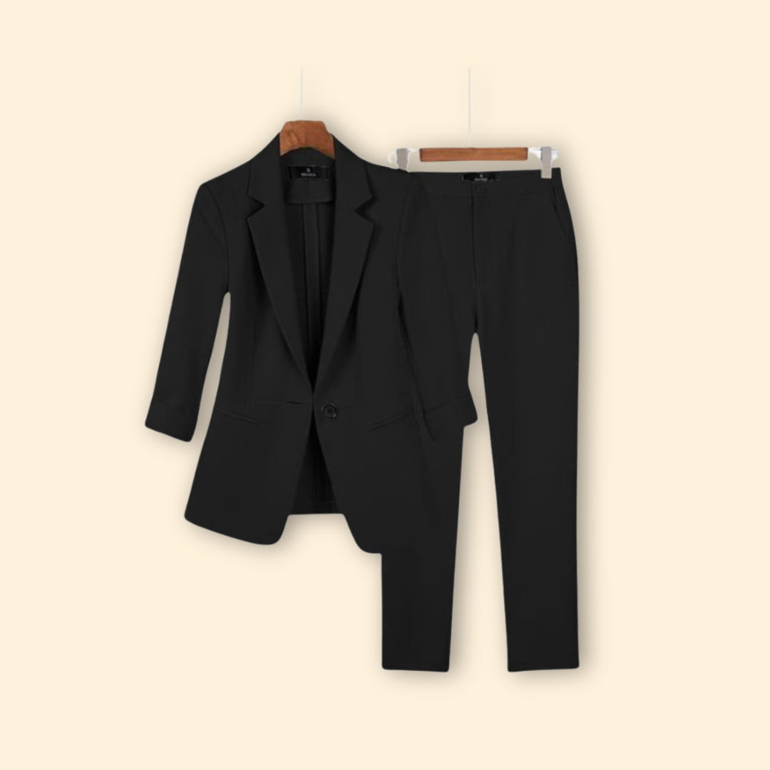 This blazer and trouser set includes a long-sleeved blazer with a notch collar and a straight-leg trouser. The blazer features a front closure and defined seams, while the trousers present a smooth waistband and full-length legs. The coordinated set offers a unified outline suited to varied settings