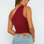 Turn heads with this stunning one-shoulder ruched crop top in a rich burgundy hue. Designed to accentuate your silhouette, the gathered side detailing adds texture and elegance to this bold, minimalist piece. The asymmetric neckline brings a modern, edgy touch while still feeling timeless and flattering.